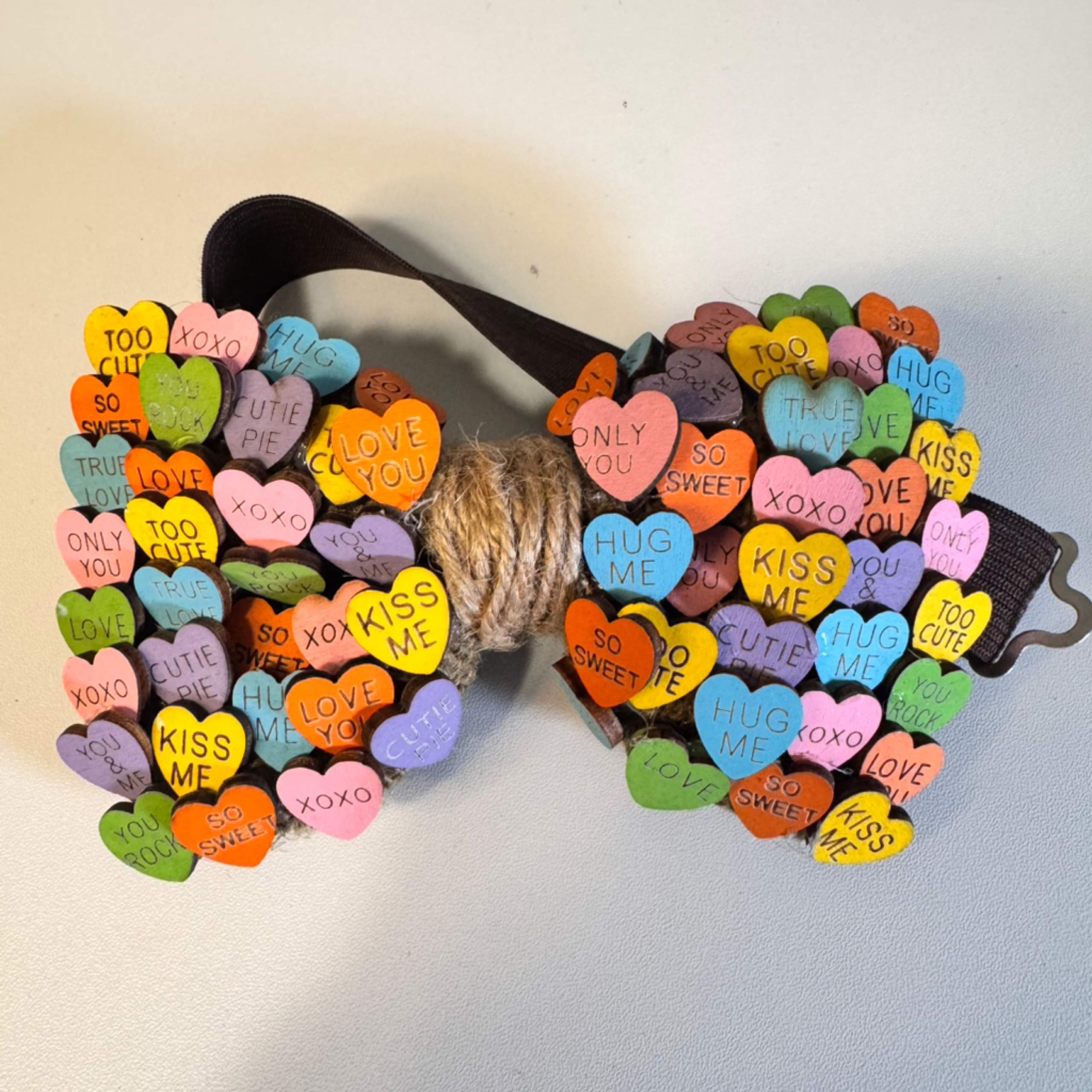 Valentine’s Day with this one-of-a-kind handcrafted bow tie, featuring a vibrant collage of classic conversation heart details. Each bow is carefully constructed with layered, colorful heart accents displaying nostalgic phrases like “Love You,” “Kiss Me,” and “Hug Me,” creating a fun yet elevated design that instantly stands out.