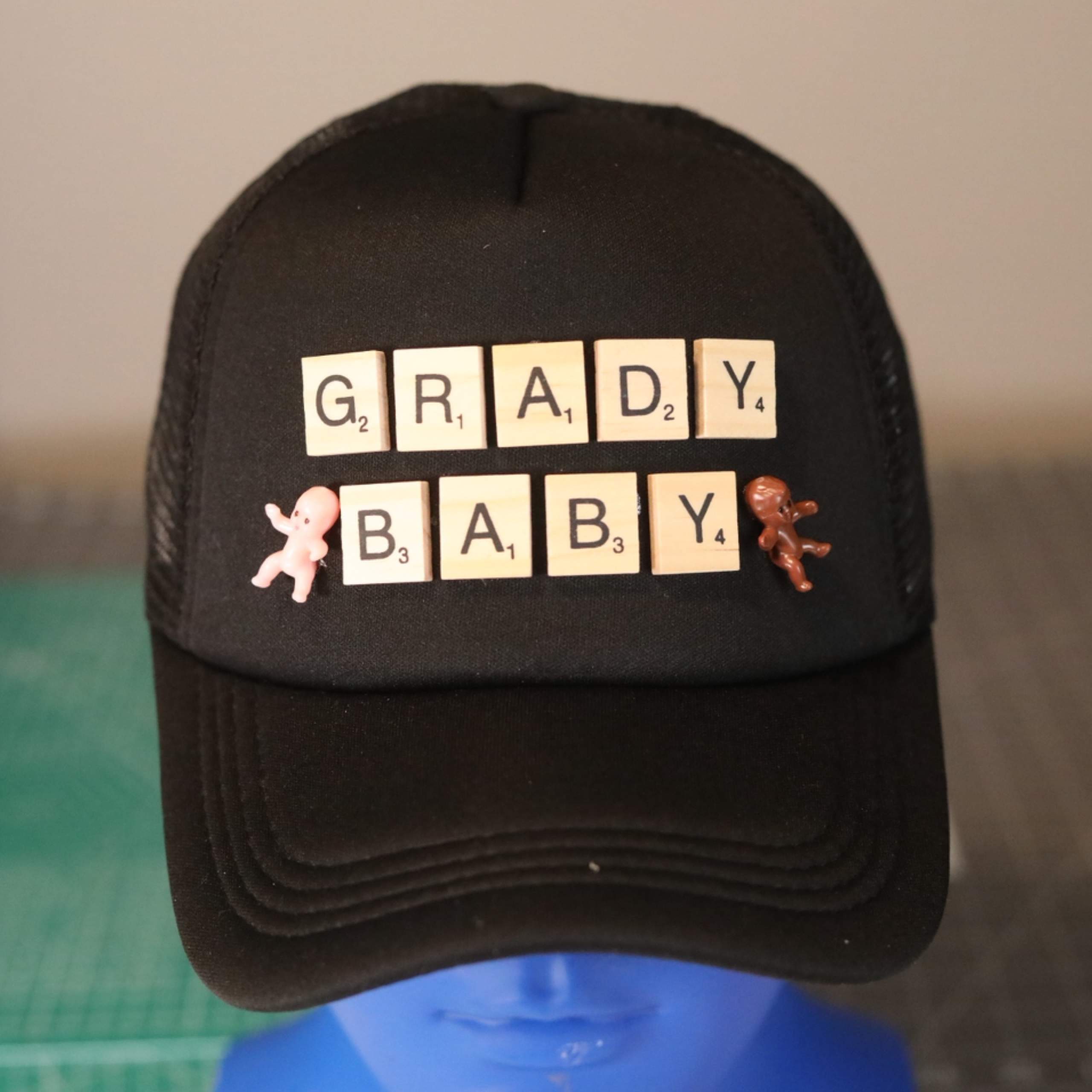 A cultural nod wrapped in humor, history, and heart. This Grady Baby trucker hat features Scrabble-style wooden tiles spelling GRADY BABY, accented with miniature baby charms on each side—adding a playful, nostalgic touch rooted in Atlanta culture.