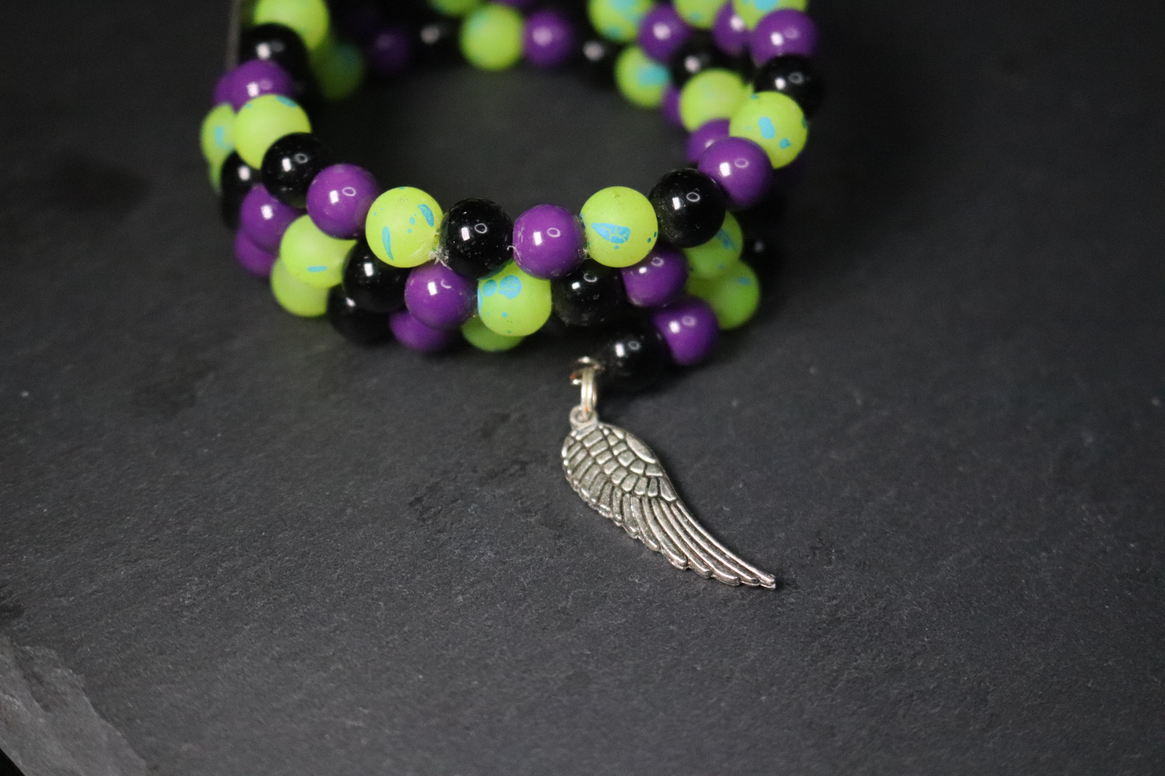 This handmade memory wire bracelet is a celebration of color, movement, and personal expression. Crafted with vibrant glass beads in bold shades of green, purple, and black, the bracelet wraps effortlessly around the wrist, creating a layered look with zero clasps or closures.