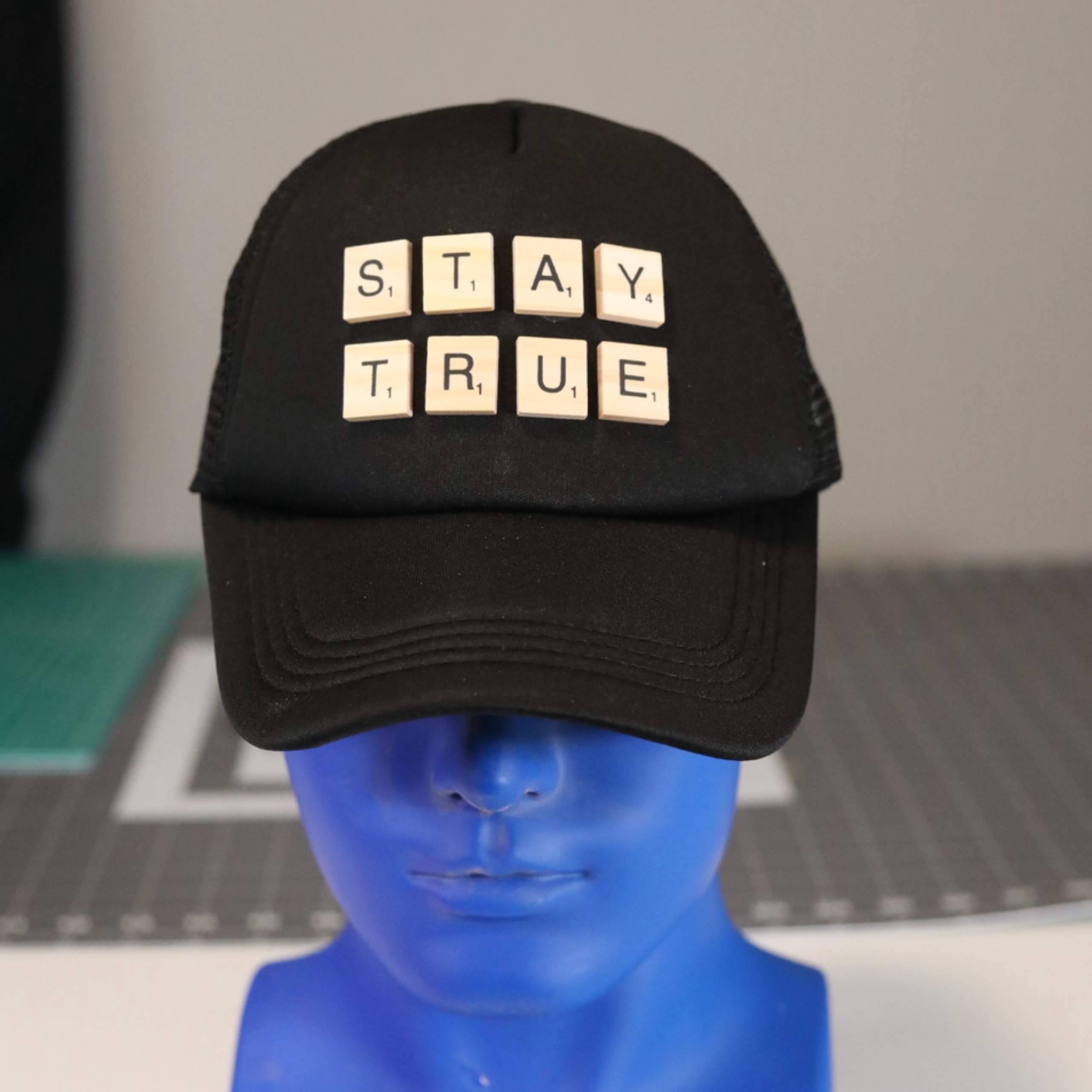 ⚫ STAY TRUE – Black Scrabble Letter Trucker Hat